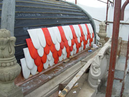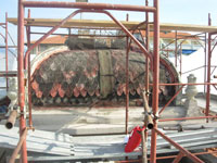 E’ stato verificato il grado di conservazione della struttura lignea componente l’ossatura lignea della cupola, attraverso il restauro o la fedele ricostruzione degli elementi a seconda del loro effettivo degrado strutturale. E’ stato inserito un nuovo telo impermeabilizzante al di sopra del fasciame ligneo che costituiva la calotta sferica, intervento necessario per eliminare le notevoli infiltrazioni d’acqua che nel tempo avevano provocato danni sia alla struttura lignea della cupola stessa sia ai soffitti e pareti decorate dei locali sottostanti ed adiacenti la cupola.